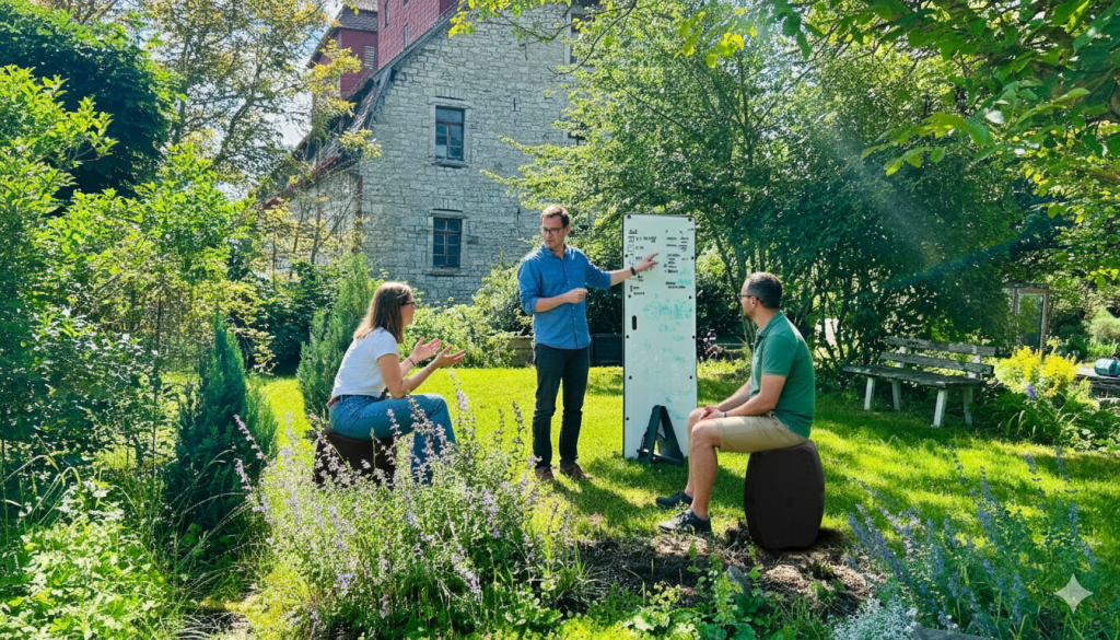 Das Klassenzimmer der Zukunft hat keine Wände. Das beigefügte Bild zeigt eindrucksvoll, wie moderne Lernkonzepte heute aussehen können: Eine Kleingruppe arbeitet konzentriert unter freiem Himmel, fernab von starren Sitzordnungen und stickiger Raumluft.